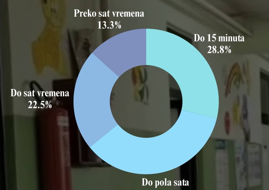 Kad je reč o čekanju na pregled, većina roditelja (64,1%) na pregled čeka do pola sata ili kraće. Čekanje do sat vremena ističe 22,6% ispitanika, a ostali (13,4%) navode da se na pregled čeka duže od sat vremena.