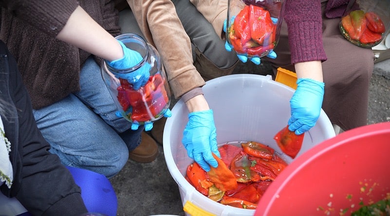 Nakon izvrsnih proizvoda sa trpeze, sišle smo u dvorište gde nam je Indira pripremila poseban ugođaj i zadatak – da svaka od nas pripremi po jednu svoju teglu peglanih crvenih paprika. Vreme sa njom nam je prošlo brzo, a njena topla dobrodošlica i trud nešto je čega ćemo se uvek rado prisećati.