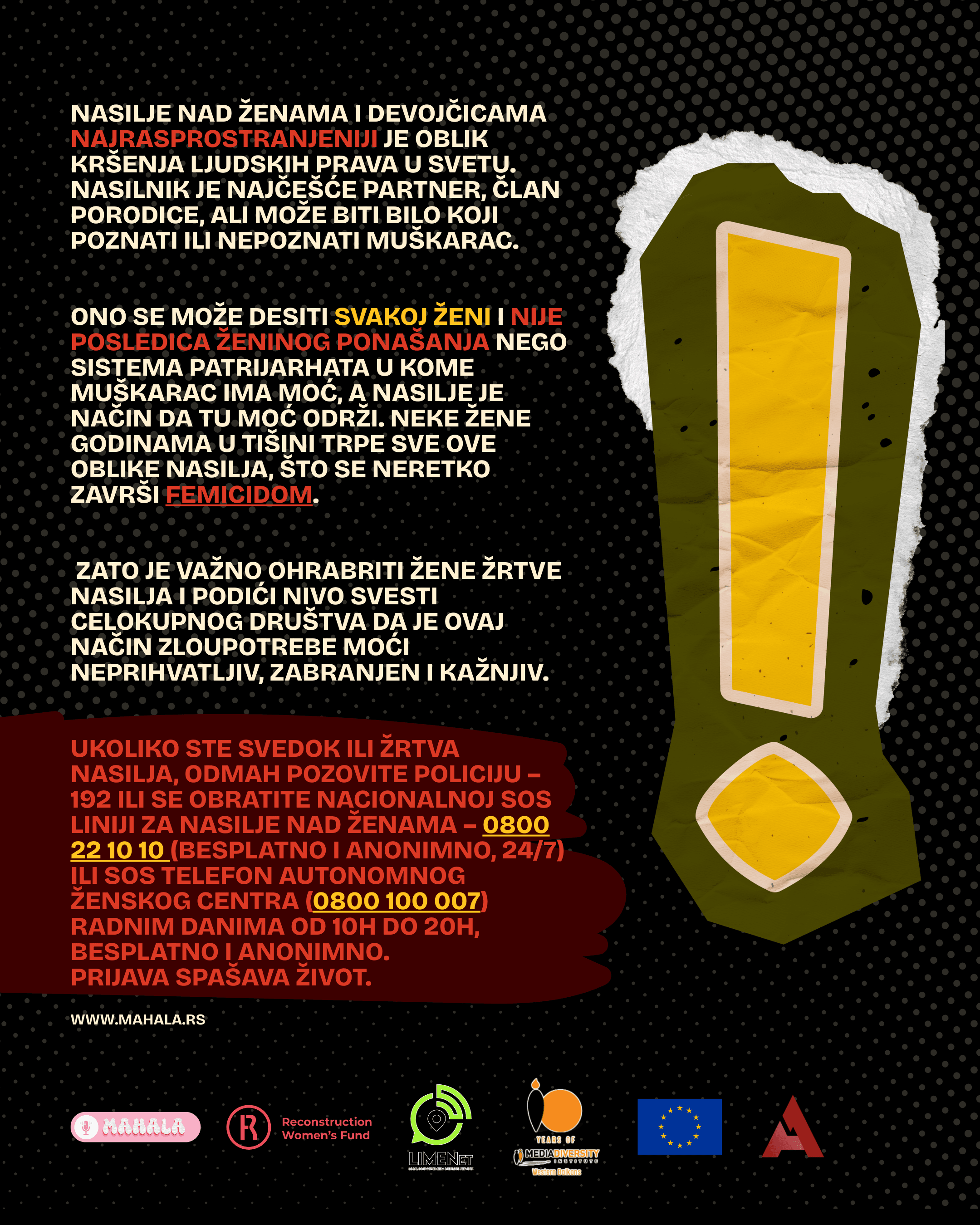 Anonimne istinite priče žena iz naše zajednice biće objavljene u narednih 16 dana na svim našim društvenim mrežama, a mi vas podsećamo na epizodu sa psihološkinjom Hanom Sejfović i aktivistkinjom Zibijom Šarenkapić gde smo govorile o tome kako prepoznati nasilje i izaći iz začaranog kruga, kao i o tome šta je ljubav a šta nije, koju možete pogledati klikom na link.